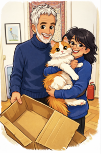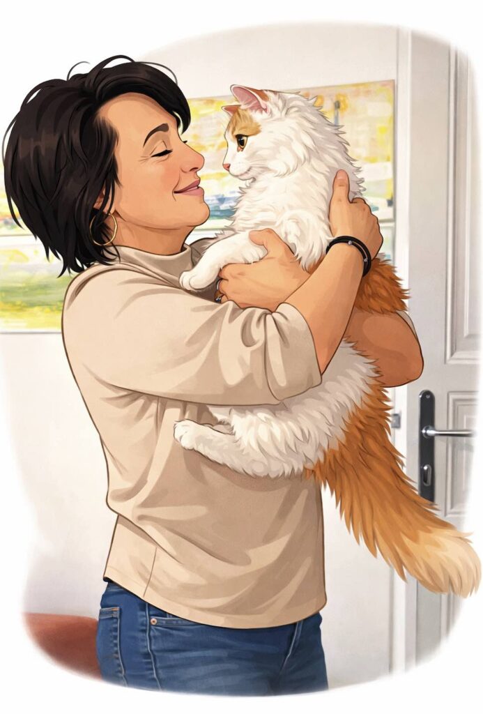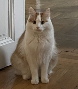 Ich bin zwar nicht ganz einverstanden damit, dass sie mich manchmal respektlos behandelt, ich meine, ich bin ja immerhin der Catking. Da kann sie hundertmal meine Prinzessin sein, dass sie zum Beispiel immer wieder einmal El Birno zu mir miaut, ist nicht nett. Sie hat das wohl daher, dass ich manchmal im Sitzen ein wenig den Eindruck erwecke, dass …, nun ja. Ihr könnt es euch vielleicht eh vorstellen, wenn ihr das Bild links anschaut. Doch ich vermiaue euch: Das sieht nur so aus. Weil ich halt, wie das bei uns Katern mit Norwegischen-Waldkatzen-Genen eben so ist, ein super schrödidichtes, langes Fell hab. Drunter bin ich rank, schlank, muskulös und topfit. Und Stichwort Birne: Das Quietschi soll vor der eigenen Türe miauen. Weil die hat einen Kugelbauch, das ist nicht mehr fein. Wir hatten Ende 2025 ordentlich Stress deswegen, der Mitbewohner und ich. Meine Frau Doktor am Mondsee – genau genommen hat sie ihre Praxis auf einem Bauernhof am Irrsee, aber wer kennt den schon – hat dieses Kugeldings, das Lini da mit sich herumschleppt, bei einer Routineuntersuchung gesehen und die Vorderpfoten über dem Kopf zusammengeschlagen. Der Mitbewohner hatte ganz schon viel Mühe, der Frau Doktor zu versichern, dass die Lini keine Babies kriegt. Kann sie ja gar nicht, hat er immer wiederholt, sie ist ja kastriert! Bis die Frau Doktor es ihm schließlich geglaubt hat. Aber normal ist das definitiv nicht, hat sie gesagt und ihren Kopf geschüttelt.