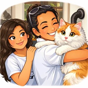 Aber ich wollte euch ja eigentlich miauen, was es so alles zu tun gab in den vergangenen Monaten. Nun, ich war wirklich schwer damit beschäftigt, mich von allen möglichen Frauen locken zu lassen. Ich bin ein echter Womanizer, sagt der Mitbewohner immer – jede Frau, die mich sieht, will mich gleich hochheben, also locken. Ich weiß zwar nicht genau, was das ist, ein Womanizer, aber der Mitbewohner hat da so einen Unterton in der Stimme gehabt, als würde er mich beneiden. Muss also was Cooles sein. Jedenfalls, dauernd werde ich gelockt. Ich genieße das sehr. Zum Beispiel war einmal die Ferienhotel-Michi aus Krems, die ja meine allerliebste Freundin ist, mit ihrem Freund Roland auf Besuch, und die hat mich gelockt auf Teufel komm raus. Oder die Shiva aus meinem Segelclub in Mondsee mit ihrer Enkelin Mia. Oder die Giulia, die mit ihrem Freund John bei uns in Graz im 3. Stock wohnt, die lockt mich auch immer. Oder die Valentina, das Patenkind von meinem Mitbewohner, die auch. Und so weiter. Ihr könnt euch das viele Locken eh auf den Cartoons genauer anschauen, die hier zu bewundern sind. Das sind oben meine Freundin Michi, unten Shiva mit Mia, und ganz unten John und Giulia, wie sie mich alle locken. Da geht ganz schön viel Zeit drauf mit der ganzen Lockerei, miau ich euch. Naja, und so hatte ich halt nie die Muße, meinem Ghostmiauer was zu diktieren, damit ihr auf dem Laufenden bleibt. Aber jetzt ist es eh soweit.