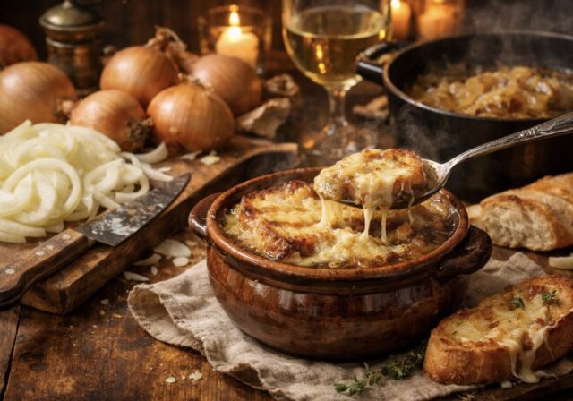 Es gibt Gerichte, die kocht man. Und es gibt Gerichte, in die man langsam hineinlebt. Die französische Zwiebelsuppe gehört eindeutig zur zweiten Sorte. Sie beginnt nicht im Topf, sondern beim ersten Schnitt durchs Zwiebelherz – diesem Moment, in dem man weiß: Heute wird geweint, aber stilvoll.
